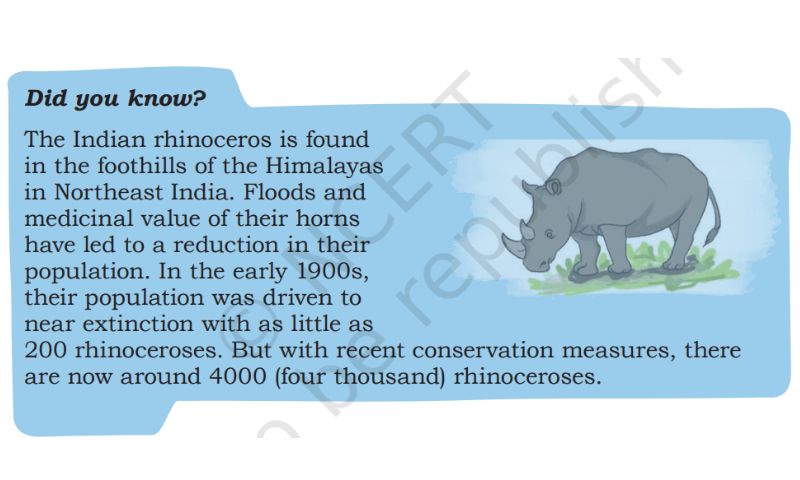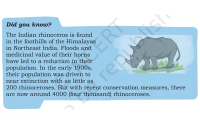 Notably, the NCERT textbook states, "The Indian rhinoceros is found in the foothills of the Himalayas in Northeast India. Floods and the perceived medicinal value of their horns have reduced their population. In the early 1900s, their population dwindled to near extinction, with as few as 200 rhinoceroses. However, recent conservation measures have increased their numbers to around 4,000."