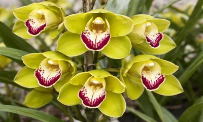 Cymbidium Kaziranga Green stands out for its clear emerald-green petals, a bright red lip edged with a prominent white border, and tall flower spikes carrying up to 18 blooms. Each flower measures approximately 3.5 inches across, combining elegance with strong colour contrast.