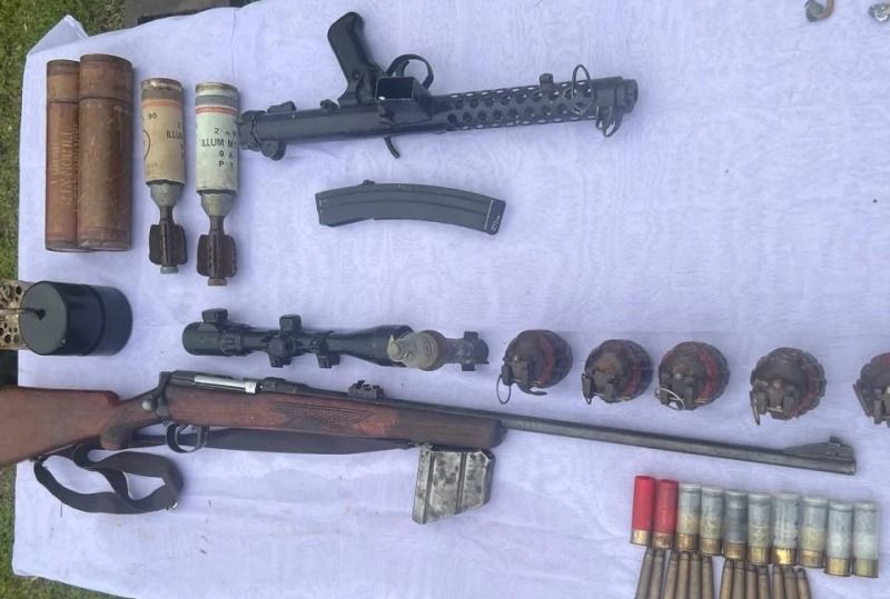 The recovered items include one AK-56 rifle with a magazine, one 303 rifle, two Chinese hand grenades, one country-made hand grenade, two improvised projectile launchers, one 12-inch SBBL gun, 10 live rounds of ammunition, and one Baofeng radio set.