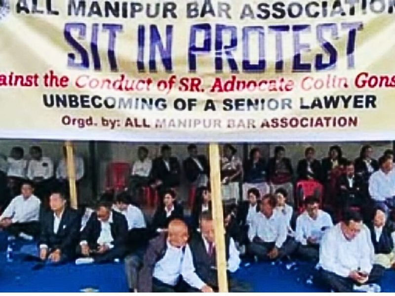 Imphal: Advocates in the state and members of the All Manipur Bar Association (AMBA) on Wednesday took their duties off and staged a sit-in protest against the conduct of Senior advocate Colin Gonsalves for his "unbecoming" of a senior lawyer inciting communal violence in this border state.