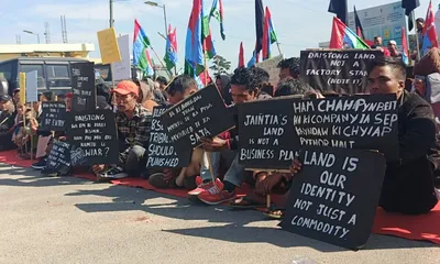 Hundreds of participants gathered in Daištong, holding placards with messages such as “Shree Cement Go Back” and “Daištong Land Not a Factory Land.” Protesters voiced their concerns in the local dialect, including the phrase “Dai thaw Beaiñ, ngi Pyrshah,” which translates to “selling land illegally, we protest.”